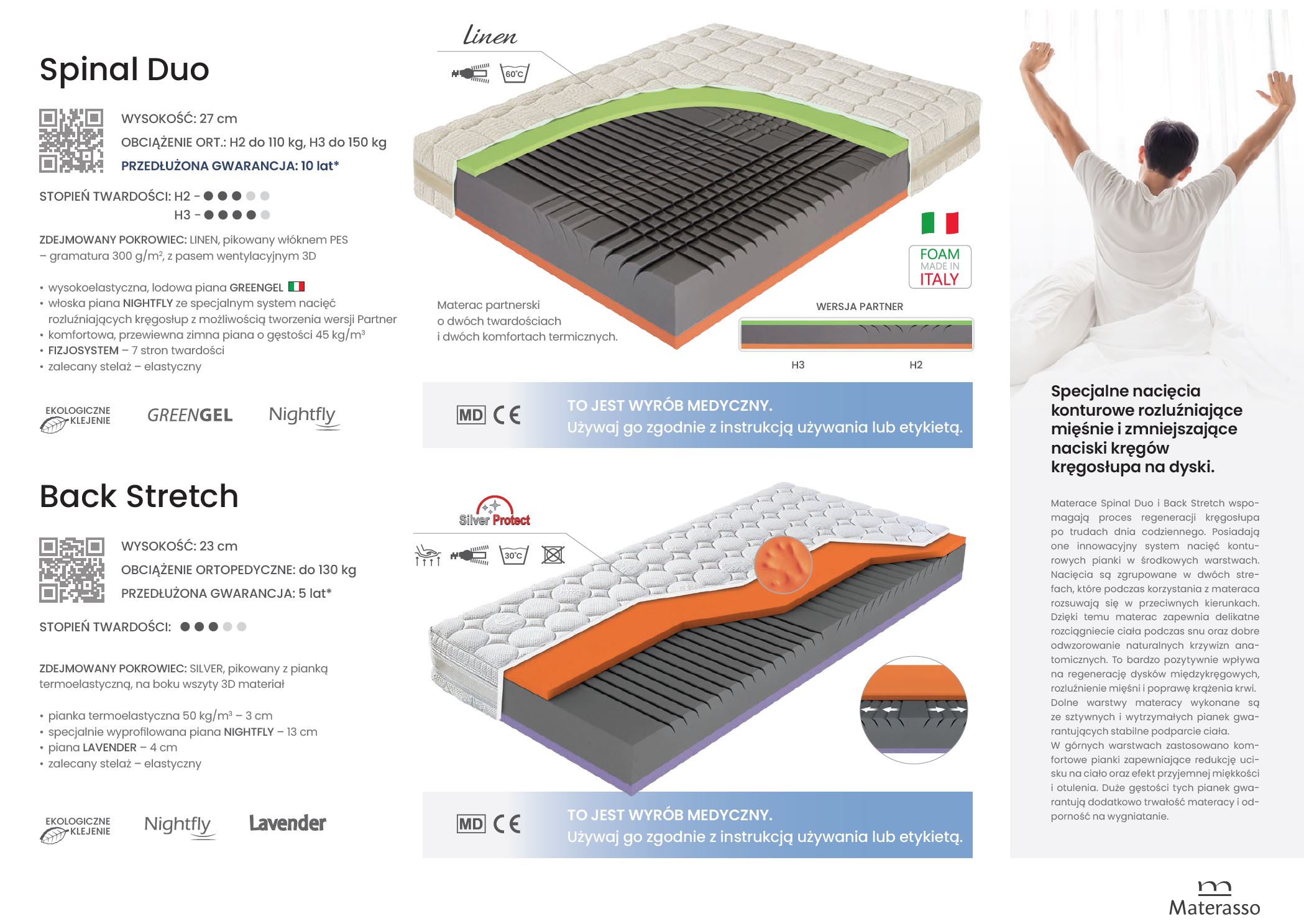 Materac Back Stretch wspomaga proces regeneracji kręgosłupa po trudach dnia codziennego. Posiada on innowacyjny system nacięć konturowych pianki w środkowych warstwach. Nacięcia są zgrupowane w dwóch strefach, które podczas korzystania z materaca rozsuwają się w przeciwnych kierunkach. Dzięki temu materac zapewnia delikatne rozciągniecie ciała podczas snu oraz dobre odwzorowanie naturalnych krzywizn anatomicznych. To bardzo pozytywnie wpływa na regenerację dysków międzykręgowych, rozluźnienie mięśni i poprawę krążenia krwi. Dolne warstwy materaca wykonane są ze sztywnych i wytrzymałych pianek gwarantujących stabilne podparcie ciała. W górnych warstwach zastosowano komfortowe pianki zapewniające redukcję ucisku na ciało oraz efekt przyjemnej miękkości i otulenia. Duże gęstości tych pianek gwarantują dodatkowo trwałość materaca i odporność na wygniatanie.
