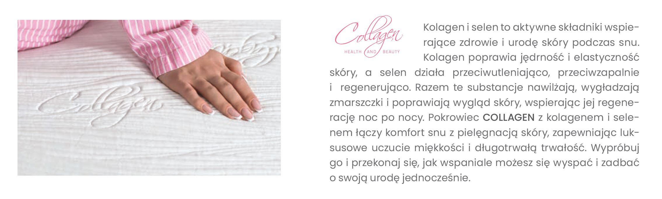 Szukasz materaca, który nie tylko zapewni Ci komfortowy i dobry sen, ale także będzie pieścił Twoją skórę? Przedstawiamy Państwu materac z pianą PREMIUM COLLAGEN, która jest dowodem innowacyjności i jakości w zakresie rozwoju materiałów na przyszłe generacje materacy. Pianka ta scala ze sobą idee zdrowia i urody, ma unikalne zdolności kopiowania i aromaterapii. Dzięki zastosowaniu kolagenu powstała pianka o unikalnych właściwościach, która łączy w sobie doskonałą elastyczność pianek z punktową adaptacją pianek Visco. Piana COLLAGEN optymalnie dopasowuje się do kształtu ciała, zapewnia idealne podparcie i rozkład nacisku, gwarantując tym samym ulgę dla kręgosłupa i stawów. Aby zapewnić najlepszą możliwą jakość snu, piana COLLAGEN została wzbogacona zapachem Natural Sleep Fragrance, który powstał na bazie naturalnych olejków eterycznych. To aromaterapia o działaniu uspokajającym. Efektem jest lepszy wypoczynek i regeneracja organizmu podczas snu. Pianka kolagenowa jest hipoalergiczna, dzięki czemu masz pewność, że śpisz w czystym i zdrowym środowisku.