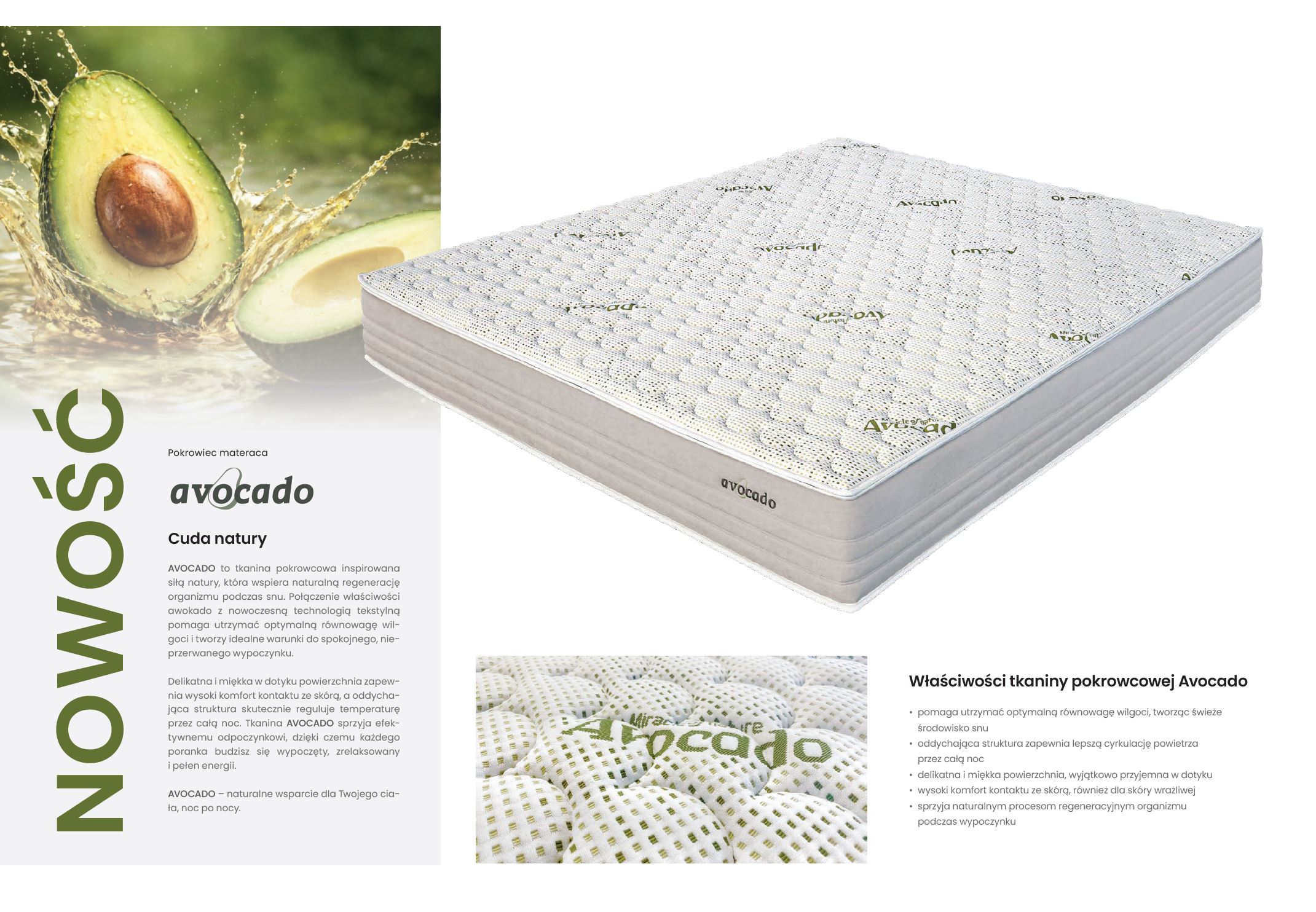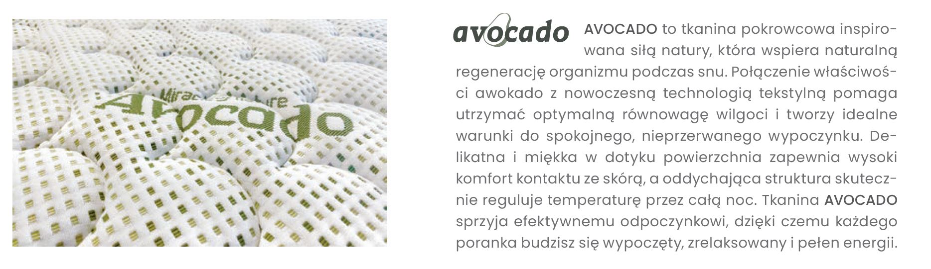 Pokrowiec AVOCADO został zaprojektowany z myślą o komforcie i higienie snu. Skutecznie odprowadza wilgoć, dzięki czemu pomaga utrzymać świeże i zdrowe środowisko wypoczynku. Tkanina wyróżnia się wyjątkowo delikatną, miękką powierzchnią, która jest bardzo przyjemna w kontakcie ze skórą. Pokrowiec jest zdejmowany i posiada wysoką gramaturę 365 g/m². Został pikowany 2-centymetrową pianką wysokoelastyczną oraz włóknem klimatyzującym 100 g/m² i 300 g/m², co poprawia wentylację materaca i zwiększa komfort użytkowania. Pokrowiec można prać ręcznie w temperaturze do 30°C, co ułatwia utrzymanie czystości i sprzyja zdrowemu, regenerującemu snu.