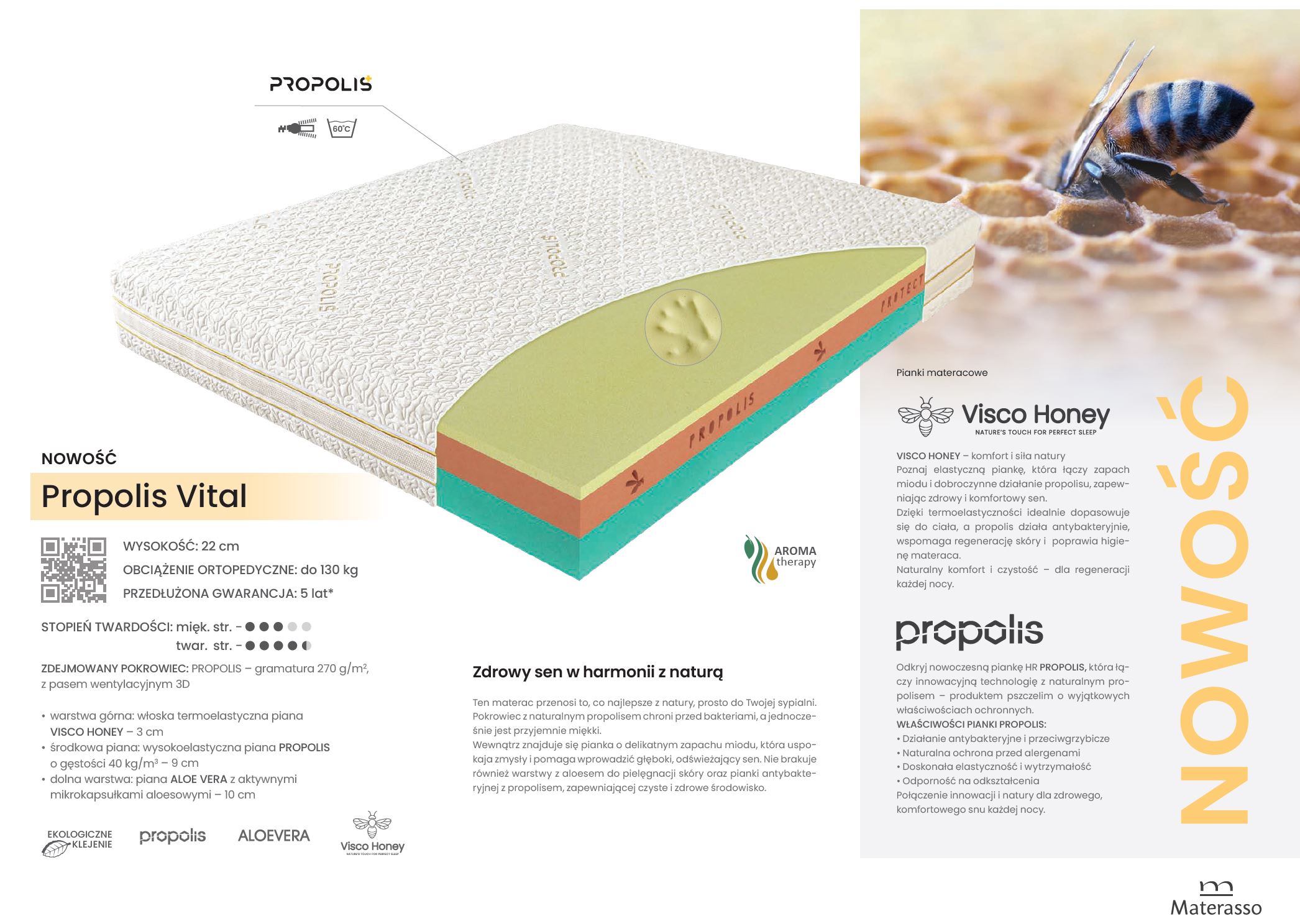 Ten materac przenosi to, co najlepsze z natury, prosto do Twojej sypialni. Pokrowiec z naturalnym propolisem chroni przed bakteriami, a jednocześnie jest przyjemnie miękki. Wewnątrz znajduje się pianka o delikatnym zapachu miodu, która uspokaja zmysły i pomaga wprowadzić głęboki, odświeżający sen. Nie brakuje również warstwy z aloesem do pielęgnacji skóry oraz pianki antybakteryjnej z propolisem, zapewniającej czyste i zdrowe środowisko.
