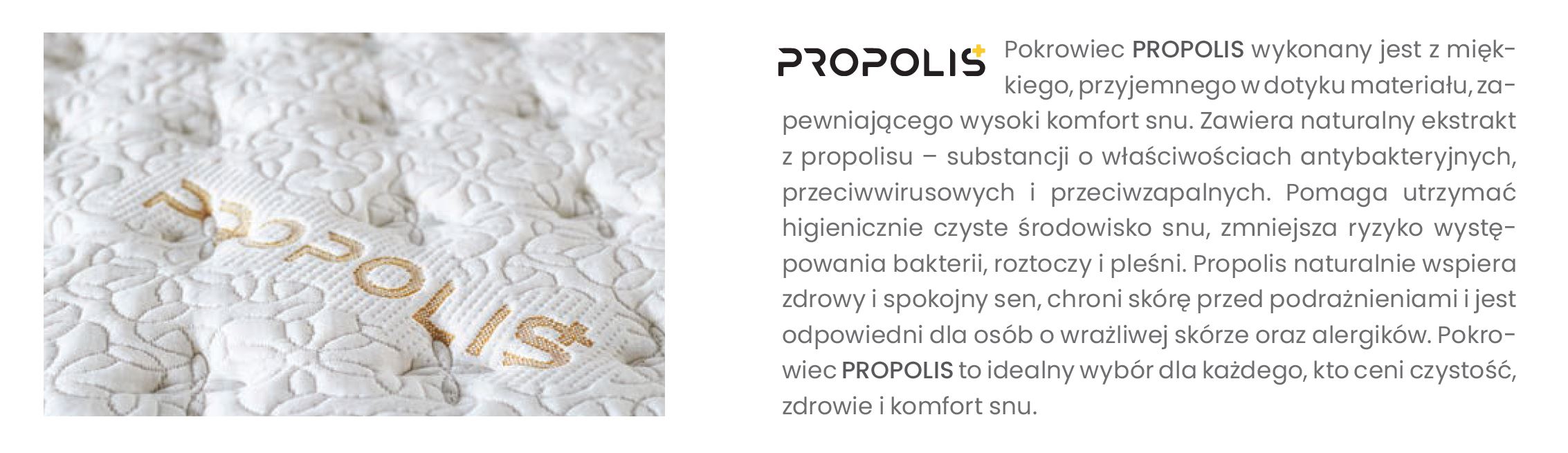 Zdejmowany pokrowiec PROPOLIS o gramaturze 270 g/m² został wykonany z tkaniny z dodatkiem propolisu o właściwościach antybakteryjnych i antyalergicznych. Wyposażony jest w pas wentylacyjny 3D, który poprawia cyrkulację powietrza w materacu i pomaga odprowadzać wilgoć. Pokrowiec można łatwo zdjąć i wyprać, co ułatwia utrzymanie higieny snu.